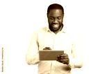 Elated businessman using pc tablet. Happy afro american entrepreneur working on touch screen tablet on white background.