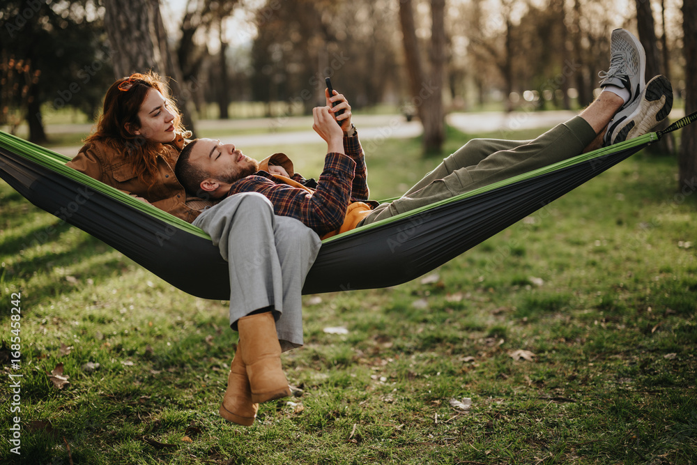 A loving couple spends time in a park, lying together in a hammock while savoring a calm moment surrounded by nature and vibrant greenery.