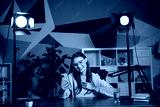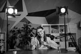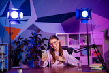 Young woman creating content in a modern studio setting with vibrant neon lighting and professional recording equipment