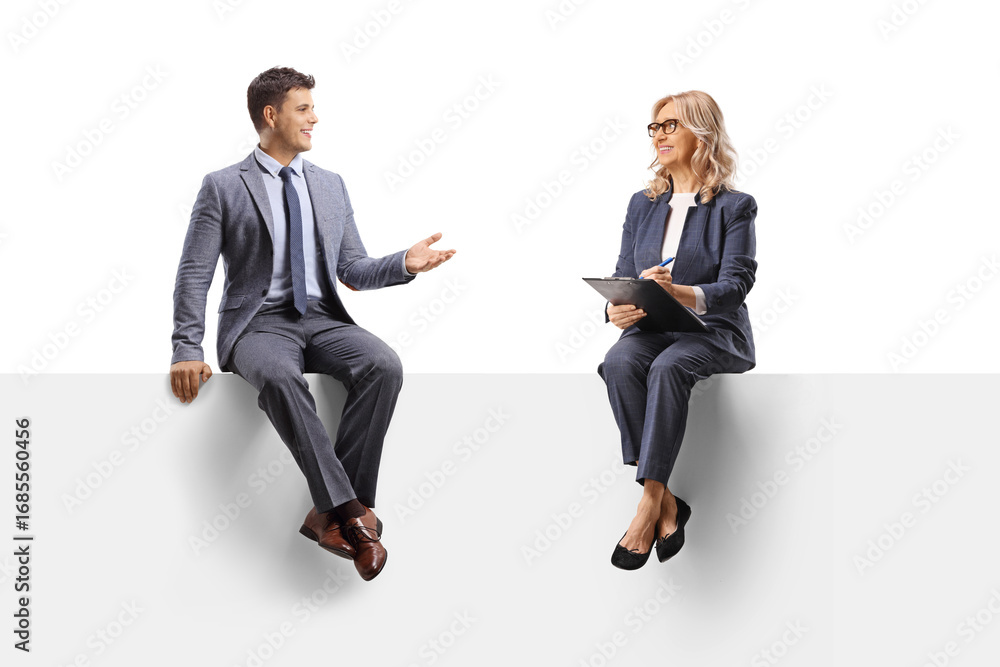 Professional woman writing a document and talking to a man