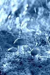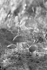 mushrooms growing in forest, sunny nature background. harvest season, picking fungi. edible russula mushrooms with red caps. Beautiful image of wild forest aesthetic. autumn season