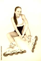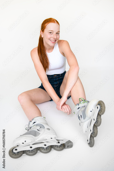 Relaxed joyful fit woman in roller inline skates on studio white background
