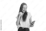 Pretty 18 years old blonde girl posing in studio holding cellphone