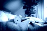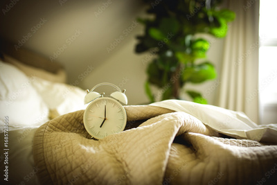 Alarm clock on bed in morning with sun light