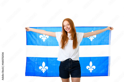 Pretty 18 years old blonde girl posing in studio with quebec flag