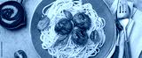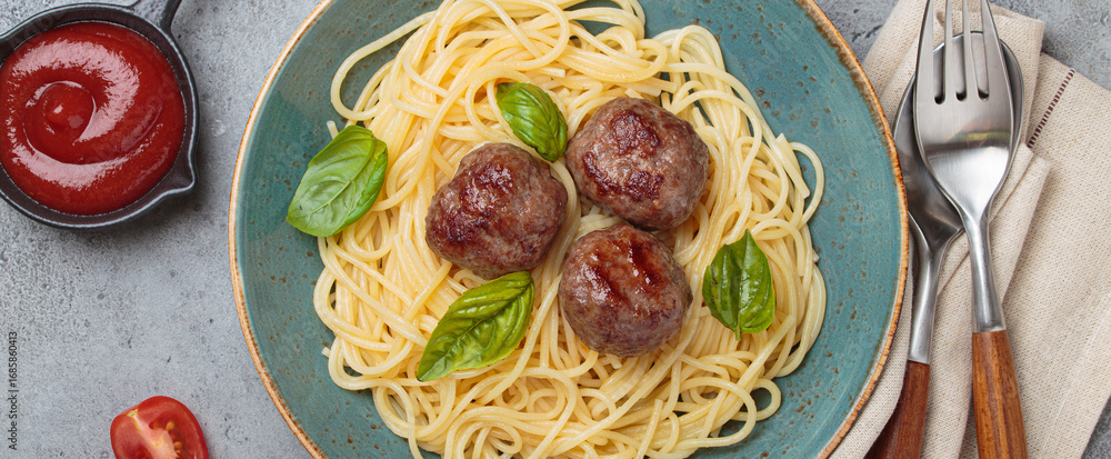 Plate of spaghetti topped with meatballs and basil leaves, accompanied by tomato sauce, fork, spoon, napkin, and tomato slices, healthy home cooking