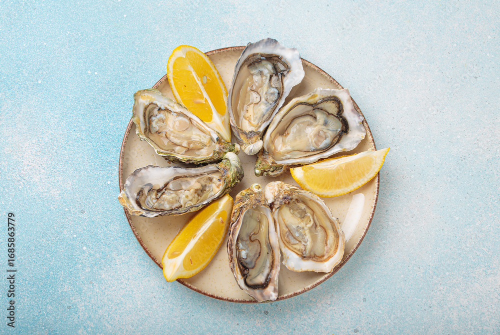 Opened oysters arranged on a plate with lemon wedges, accompanied by an oyster knife, creating a seafood presentation on a blue background top view
