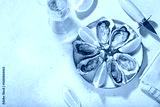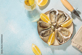 Open oysters are served on a plate with lemon wedges and ice alongside two glasses of chilled white wine, creating an elegant and refreshing seafood dining experience on sunny day, copy space