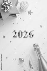 Festive vertical composition celebrating the new year 2026 with gold decorations and champagne.