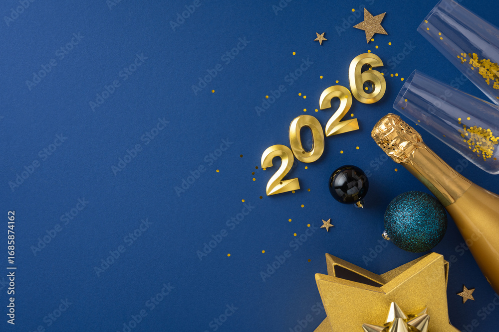 Festive arrangement featuring golden 2026 figures, holiday ornaments, and champagne glasses on a blue backdrop symbolizing New Year celebrations and the arrival of 2026