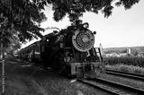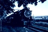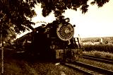 A historic steam locomotive travels along railway tracks surrounded by lush green fields and trees at sunset. The train emits steam and the sun casts a warm glow on the landscape.