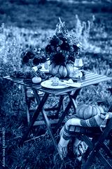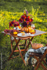Beautiful elegant autumn table setting for thanksgiving family dinner or wedding. Orange pumpkin with flowers as centrepiece. Cozy fall home atmosphere. Wineglass, romantic marriage proposal, sunset