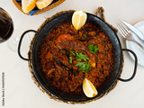Delicious traditional Valencian seafood paella, savory rice dish with shrimps, squid and clams served in paellera with lemon slice..