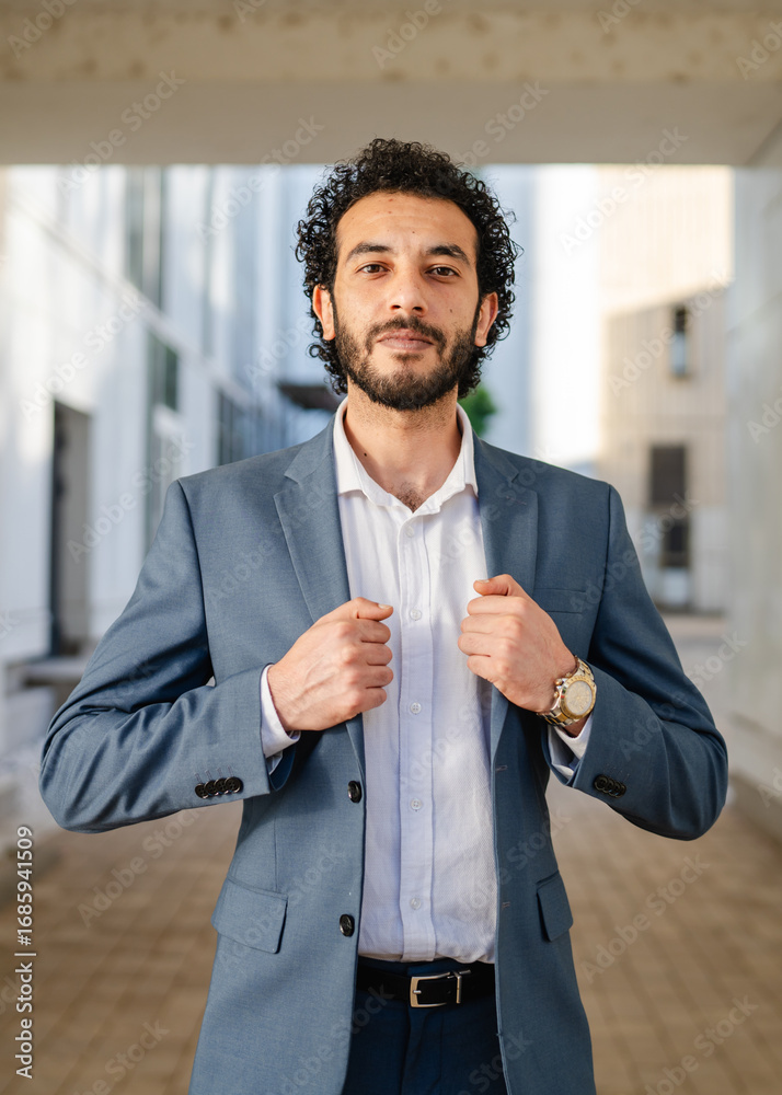 Confident businessman adjusting suit in modern city setting