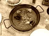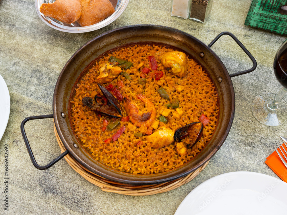 Detail of traditional spanish paella cooked in special pan, ready to eat.