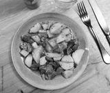 Appetizing stew of beef with boiled potatoes, mushrooms and vegetables