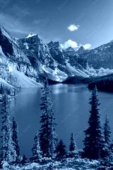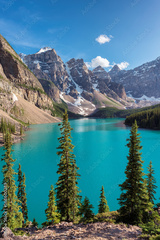 Beautiful turquoise waters of the Moraine lake with snow-covered peaks above it in Banff National Park of Canada