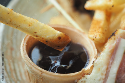 Savory fries dipped in rich sauce at a cozy restaurant