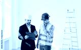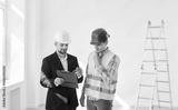 Businessman and builder discuss and calculate estimates for a renovation or construction project in a new home or office. The conversation focuses on meticulous planning and budgeting.