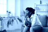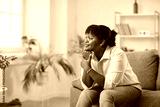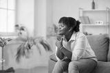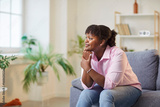 Smiling African American woman, full of joy, sits on a sofa at home. Her expression is positive, reflecting satisfaction and a dreamy mood, highlighting a moment of personal happiness and relaxation.