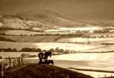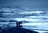 Exmoor ponies on Wilmington hill under dramatic morning light with Firle beacon lit up in the background south downs east Sussex south east England UK