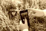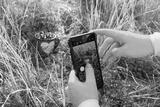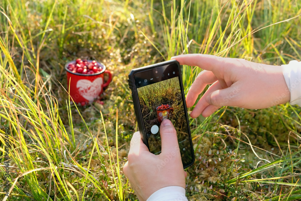 Hands with smartphone records video or photo of harvest of wild berry on mobile phone. enamel mug with picking ripe red cranberries in forest, abstract natural background. selective focus