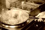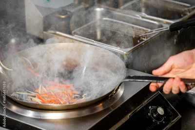 Chef stir-frying vegetables in a hot pan at a commercial kitchen. Steam rises as red peppers and bean sprouts cook over a gas burner. Professional culinary environment