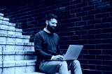 Portrait of smiling elegant businessman sitting on staircase with laptop in lap and typing on it.
