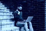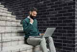 Portrait of cheerful classy businessman sitting on staircase outdoors with laptop in his lap and celebrating victory.
