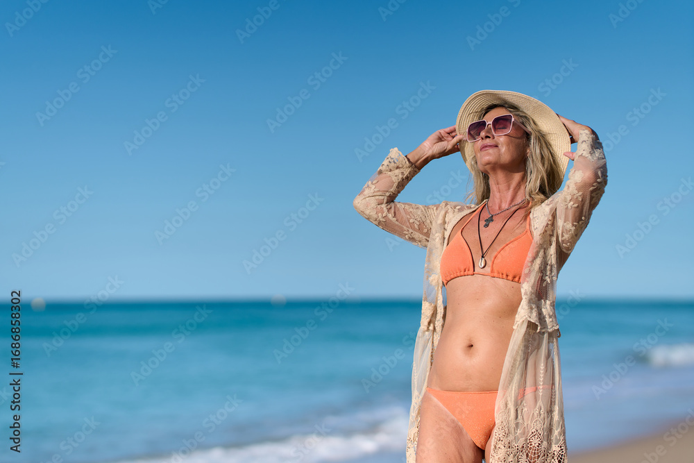 Mature woman enjoying sun and sea on tropical beach