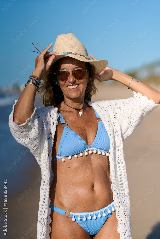 Stylish mature woman enjoying sunny beach day, holding hat and smiling