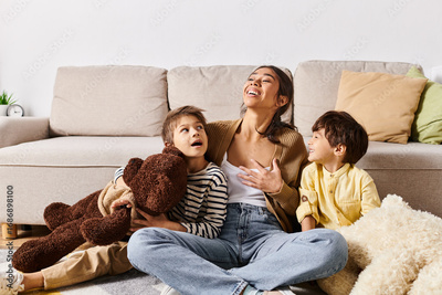 Joyful moments shared between a young mother and her adorable children indoors