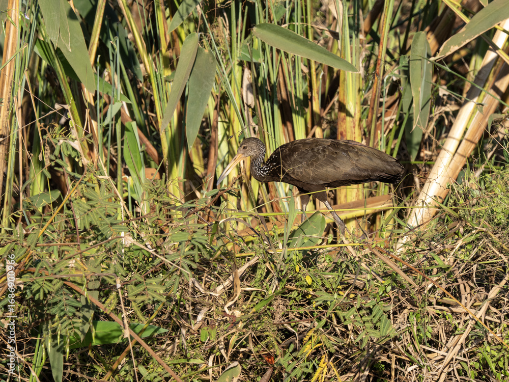 Brazil. Pantanal, limpkin, Aramus guarauna, foraging in coastal vegetation