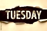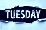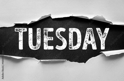 Torn paper reveals the word TUESDAY in bold grunge letters. Symbol of second day of the workweek, progress, productivity, motivation, organization, planning, focus, and steady achievements