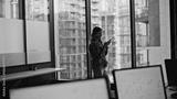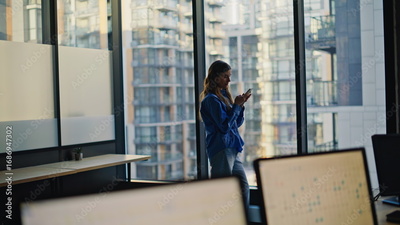 Happy businesswoman texting cellphone resting at office. Lady reading message