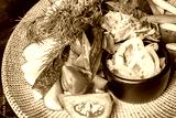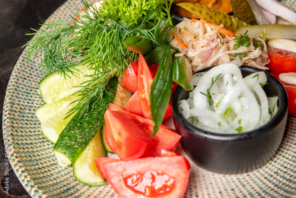 Assorted fresh and pickled vegetables on a plate, including cucumbers, tomatoes, onions, sauerkraut, herbs, and gherkins. Top view, vibrant colors, healthy appetizer