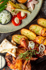Assorted grilled chicken, potatoes, flatbread, cold cuts, cheese, and vegetables served on plates. Rustic restaurant-style food presentation, top view