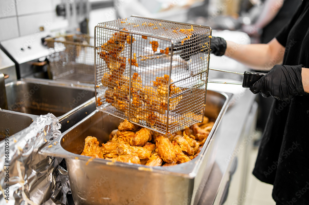 Commercial kitchen scene with gloved hands handling fried chicken wings in a metal basket over a deep fryer, showcasing high-volume food preparation in a professional setting.