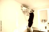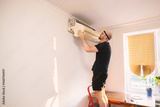 A man on a ladder installs or repairs an air conditioner unit on a wall, ensuring home comfort. Focus on maintenance, installation, and domestic service.