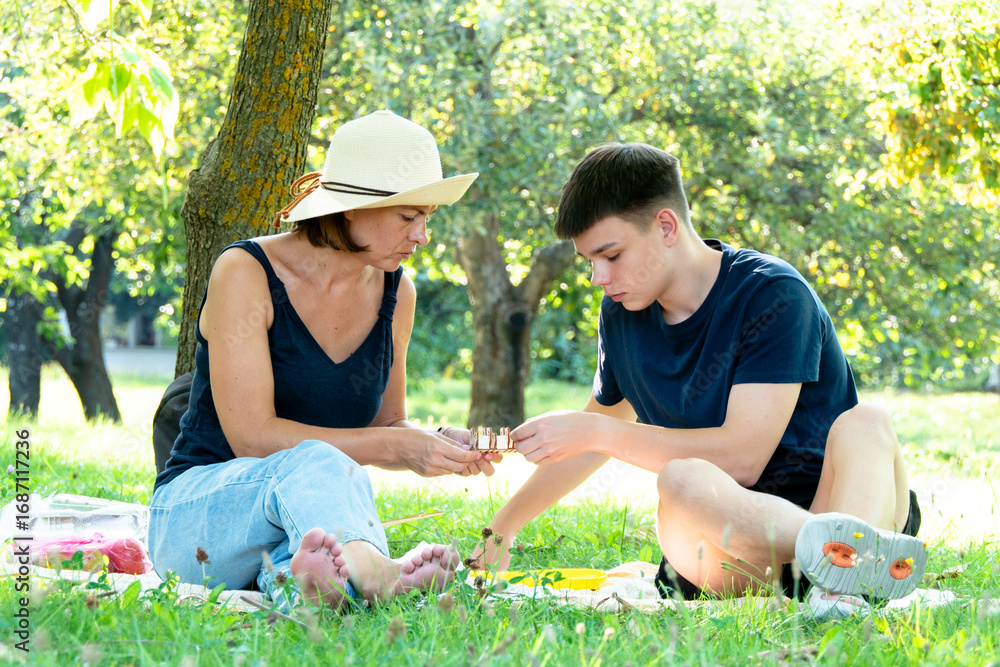 Mother and son engrossed in assembling a wooden craft outdoors on a sunny day. Capturing family bonding, creative leisure, and summer fun in a natural park setting.
