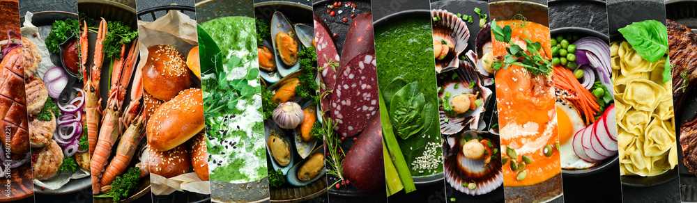 Background of food, drinks and dishes of European cuisine. on a dark stone background. Photo collage, banner from photos.