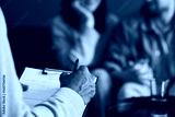 Middle aged Black man holding clipboard and pen conducting counseling session with young Caucasian couple sitting together in background, couple holding hands and listening attentively