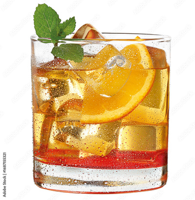 copo de whisky com fatia de laranja e folha de hortelã isolado em fundo transparente