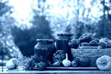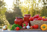 fresh tomatoes, peppers, onions, garlic, parsley, homemade preserved glass jars on table in garden close up, nature background. harvesting, assorted of raw vegetables for cooking healthy vitamin food