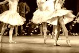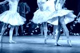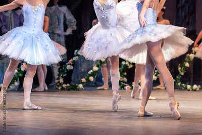 dancing, passion, popularity concept. group of magnificent ballerinas wearing adorable blue dresses with tutus and sparkling sequins, white tights and satin pointe shoes