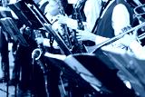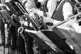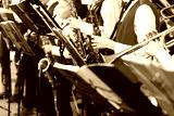 musical instrument, brass band and orchestra concept - closeup ensemble of musicians playing on trumpet and saxophone in red concert costumes, music stand, male hands with equipment, selective focus