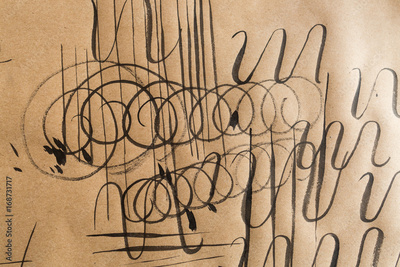 calligraphy, practice, education concept. on light brown paper for sketching there are lots of different types of lines such as curly, swirl, thick and thin, varied, parrellel and jagged