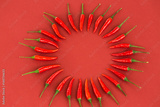 red hot chili peppers, popular spices concept - art decoration by hot chili peppers pod, still life circle composition on red background, top view, flat lay, free space for text