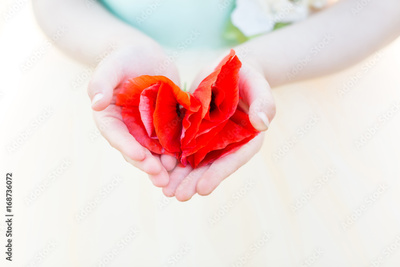 nature, flora, tenderness, childhood, childcare - closeup of little tender palms of child holding few bright scarlet buds of poppy flowers