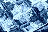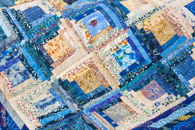 patchwork, handmade, sewing, interior, home cosiness concept - colourful folksy quilt in blue shades made of ornate snippets with floral prints stitched together in form of squares